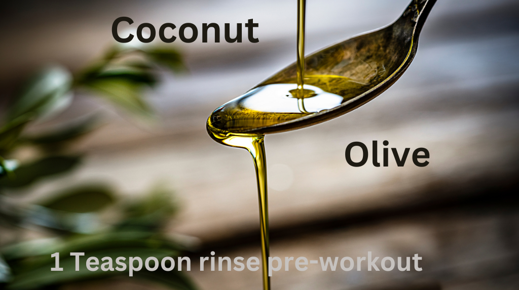 Try this out: Rinse your mouth with a teaspoon of coconut oil or olive oil before a workout, it could send early signals to your brain to burn fat more efficiently., and remember to spit it into the garbage so as not to clog the sink. If you’re taking it a step further by doing oil pulling, another thing I highly recommend, be sure to spit it out so as not to swallow the toxins pulled.